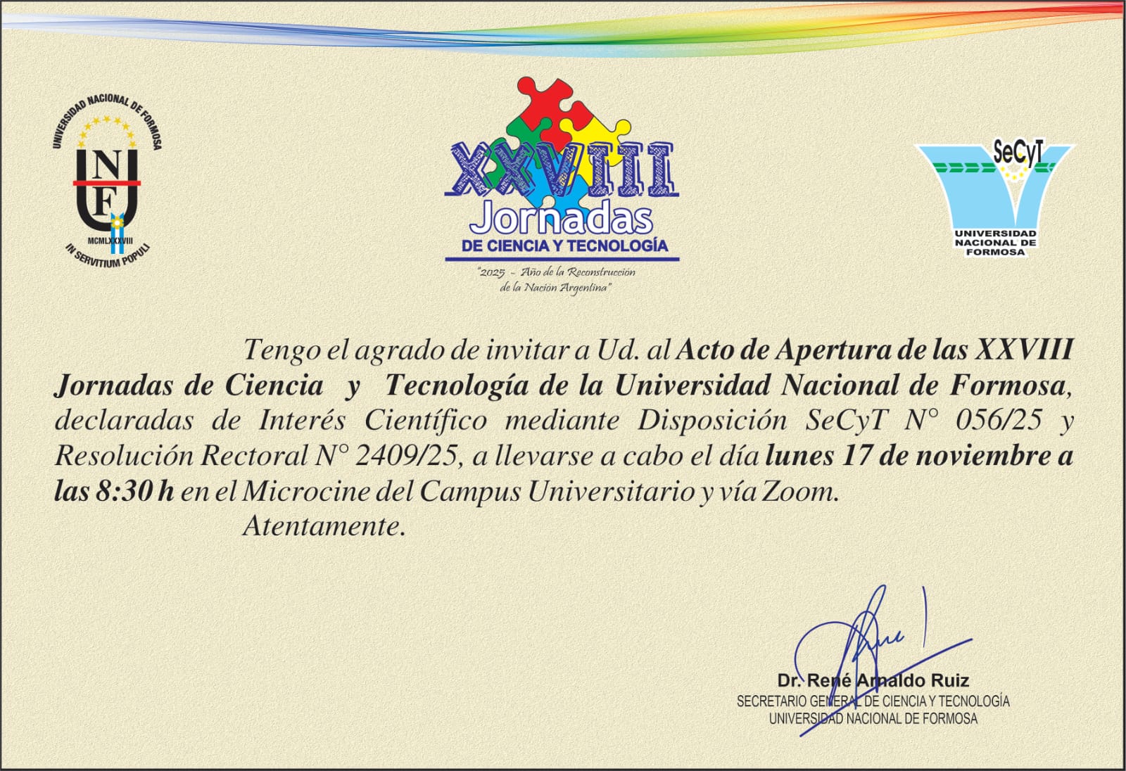 El Secretario General de Ciencia y Tecnología de la Universidad Nacional de Formosa (SeCyT-UNaF), el Dr. René Arnaldo Ruiz, invita a participar de las XXXVIII Jornadas de Ciencia y Tecnología.